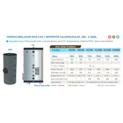 Depósito con doble serpentín para producción y acumulación de Agua Caliente Sanitaria (ACS). Funcionamiento estándar a 8 bars en Inox 316L. Calderín: Acero inoxidable, Capacidad: 300 litros, Serpentín Principal: 1,32 m2, Serpentín Auxiliar: 0,96 m2, Medidas: 180 x 60 cm, Resistencia opcional.