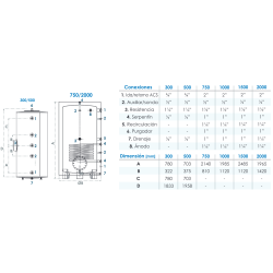 Calderín: Inox 2304 , capacidad: 500 litros, 1 serpentín de 1,32m2, Medidas: 180 X 69 cm, tipo soporte: Mural , Resistencia: Opcional 1"¼