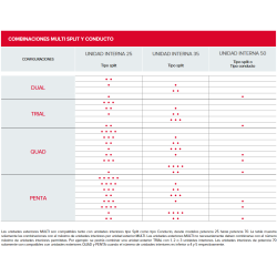 Este modelo DUAL está diseñado para conectar hasta 2 unidades interiores, sin que sea obligatorio alcanzar ese máximo. Puedes instalar solo una unidad interior si así lo requiere el proyecto, lo que ofrece gran flexibilidad de configuración. Las combinaciones posibles van desde modelos de potencia 25 hasta 70, siempre respetando las indicaciones del fabricante para garantizar un rendimiento óptimo.