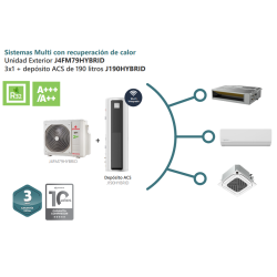 El Multisplit Unidad Exterior 3x1 JOHNSON Multi Hybrid con recuperación de calor es la solución perfecta para quienes buscan confort, eficiencia energética y ahorro real en climatización y agua caliente sanitaria. Este sistema completo permite conectar hasta tres unidades interiores (splits, conductos, cassettes o consola suelo), ofreciendo una climatización personalizada en diferentes estancias y un depósito de 190 litros especialmente diseñado para abastecer viviendas de hasta 6 personas.