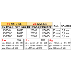 El sistema de doble pared DW25 está formado por elementos modulares rígidos con acabado brillo BA , fabricados con pared interior de acero inoxidable AISI 316L con un espesor mínimo de 0,4 mm y pared exterior de acero inoxidable AISI 304 , conforme a las normas exigidas por el marcado CE según la norma EN 1856/1 . El aislamiento está realizado con lana mineral de alta densidad de 25 mm de espesor, prensada y colocada entre los muros sin elementos de unión entre ellos (puente térmico). Los elementos modulares tienen un clásico acoplamiento macho-hembra calibrado para ambas paredes con junta de triple labio para insertar en la pared interna, de acuerdo con la norma europea EN 14241-1, y junta mecánica con banda de seguridad.