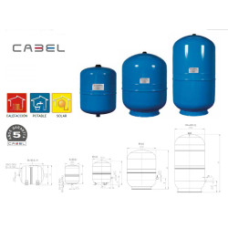 El vaso de expansión CABEL VEM150L10B está especialmente diseñado para instalaciones de agua caliente sanitaria (ACS). Su función es absorber el aumento de presión provocado por la elevación de temperatura en el circuito, evitando daños en la instalación y manteniendo una presión constante y segura.