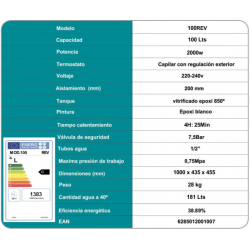 Prestaciones: 4 /5, Calidad : 4 /5, Resistencia: Blindada Antical, Medidas: 97x46x27 cm, Termostato: 40 a 80º, Consumo Anual: 527kW