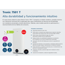 El BOSCH Tronic 7501 T incorpora resistencia envainada y ánodo electrónico, que evitan la necesidad de vaciado del depósito para su mantenimiento. Estos componentes protegen el interior del termo contra la corrosión, prolongando la vida útil del equipo. Además, Bosch ofrece hasta 7 años de garantía en el depósito, lo que garantiza una inversión segura a largo plazo.