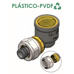El Codo Hembra Compresión FERCO Ø 20 - ½" es una solución eficiente y de alta calidad para instalaciones de agua caliente sanitaria (ACS) y calefacción. Fabricado con tecnopolímero PVDF, este fitting plástico combina durabilidad y rendimiento superior, destacándose por su resistencia química, baja corrosión y excelente aislamiento térmico y acústico.