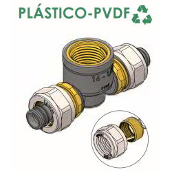 La Te Hembra Compresión FERCO Ø 16 - ½" es una pieza esencial para sistemas de calefacción y agua caliente sanitaria (ACS), diseñada para ofrecer máxima eficiencia y durabilidad en instalaciones modernas. Fabricada en tecnopolímero PVDF (fluoruro de polivinilideno), combina resistencia química, baja corrosión y propiedades aislantes, ideales para entornos exigentes.